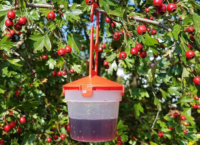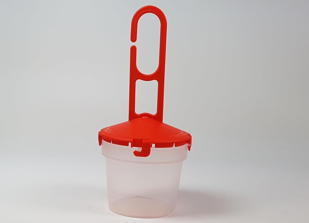 Die rote Deckelfarbe soll die Kirschessigfliege anlocken. Durch die durchsichtigen Becher ist eine Kontrolle der Fallen ohne Öffnen möglich.
