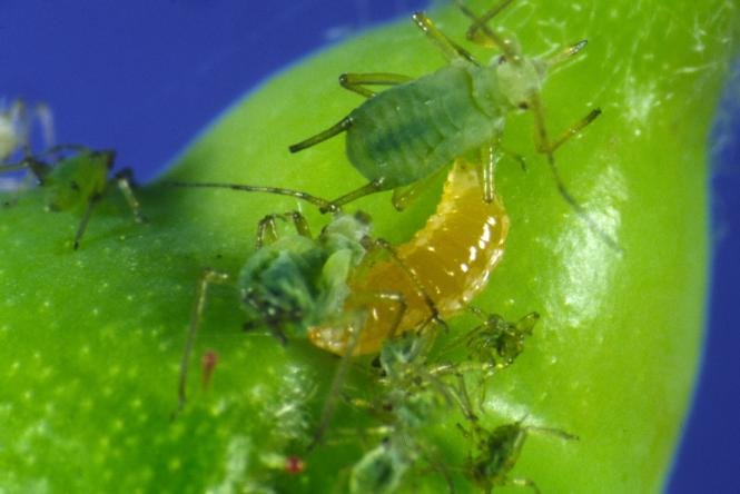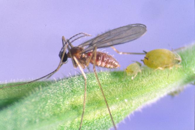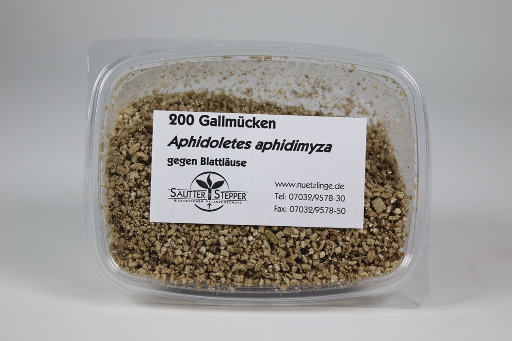 Die Gallmücke Aphidoletes aphidimyza wird zur Bekämpfung von vielen Blattlaus-Arten eingesetzt. Ein sehr guter Bekämpfungserfolg wird erzielt bei der Grünen Gurkenblattlaus (Aphis gossypii), der Grüngestreiften Kartoffelblattlaus (Macrosiphum euphorbiae) und der Grünen Pfirsichblattlaus (Myzus persicae). Der Körper der adulten Gallmücke ist braun gefärbt mit orangefarbenen Hinterleib und etwa 2 mm groß, die feingliedrigen Beine sind etwa 3,5 mm lang. Im Vergleich zum Weibchen, das nur leicht gebogene Fühler hat, besitzt das Männchen einen sog. "Widderkopf" mit auffallend gebogenen und gefiederten Fühlern. Die Larven sind leuchtend orange gefärbt und 0,4-3 mm groß.