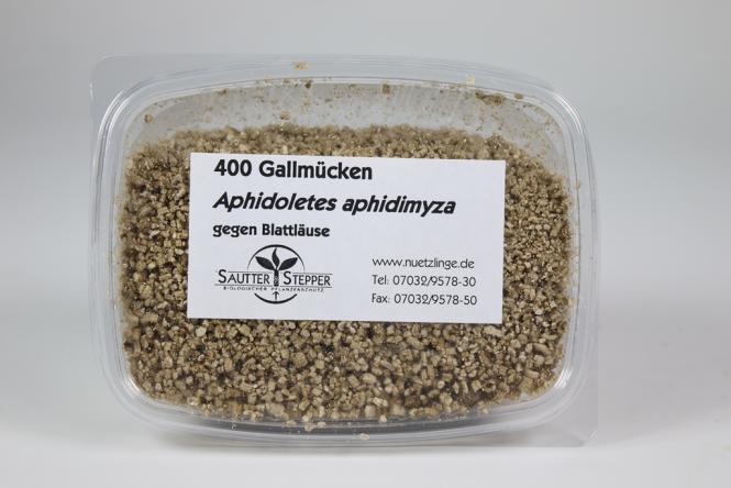 Die Gallmücke Aphidoletes aphidimyza wird zur Bekämpfung von vielen Blattlaus-Arten eingesetzt. Ein sehr guter Bekämpfungserfolg wird erzielt bei der Grünen Gurkenblattlaus (Aphis gossypii), der Grüngestreiften Kartoffelblattlaus (Macrosiphum euphorbiae) und der Grünen Pfirsichblattlaus (Myzus persicae). Der Körper der adulten Gallmücke ist braun gefärbt mit orangefarbenen Hinterleib und etwa 2 mm groß, die feingliedrigen Beine sind etwa 3,5 mm lang. Im Vergleich zum Weibchen, das nur leicht gebogene Fühler hat, besitzt das Männchen einen sog. "Widderkopf" mit auffallend gebogenen und gefiederten Fühlern. Die Larven sind leuchtend orange gefärbt und 0,4-3 mm groß.
