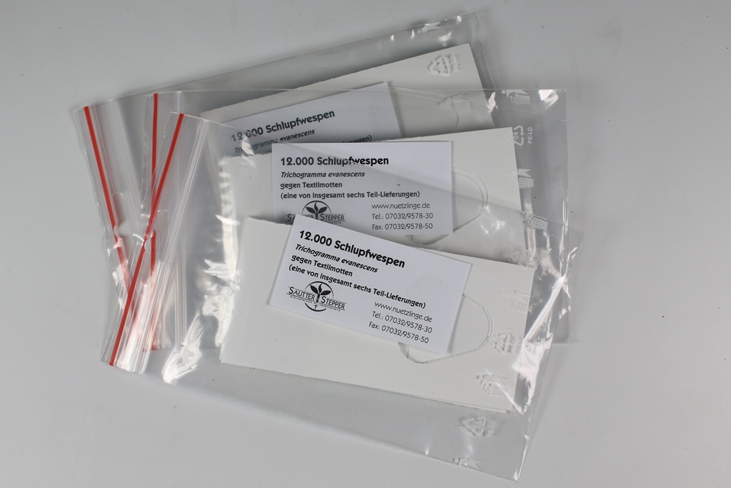 Um den Entwicklungszyklus der Motten wirksam zu unterbrechen, sind sechs Freilassungen der Schlupfwespen im Abstand von jeweils drei Wochen notwendig. Bei jeder Freilassung wird ein Papp-Kärtchen pro Regalfach von ca. 80 cm bis 1 m bzw. auf jeden dritten Kleiderbügel verteilt. Die Kärtchen sind im Inneren mit jeweils 3.000 parasitierten Eiern bestückt. Nach wenigen Tagen bei Zimmertemperatur beginnen die Trichogramma nach und nach zu schlüpfen und beginnen mit der Suche nach den Motten-Eiern. Die Karten werden ähnlich einem Mini-Abo, automatisch alle drei Wochen verschickt. Ersetzen Sie die "alten" Kärtchen mit denen der Nachlieferung und überlassen Sie die Arbeit den Wespen ...