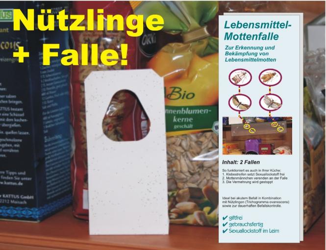 Fallen:Mit den Pheromonfallen fangen Sie zusätzlich männliche, erwachsene Motten ab. Durch einen natürlichen Sexuallockstoff der Weibchen (Pheromon) werden männliche Motten angezogen und auf dem Leim festgehalten.