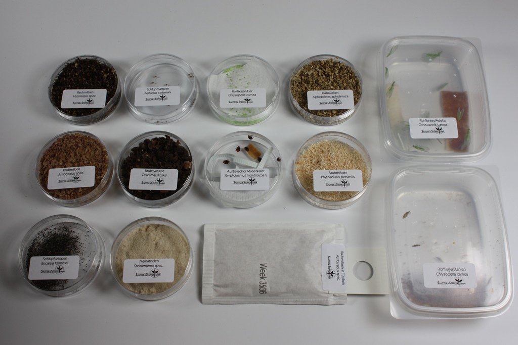 Das Anschauungsset beinhaltet Petrischalen mit 10 verschiedenen Nützlingen/Nützlingsstadien.