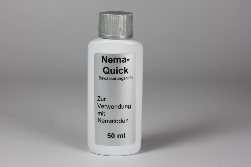 Nema-Quick enthält biologisch abbaubare, nicht ionische Tenside. Diese setzen die Oberflächenspannung des Wassers herab. Dadurch können die Nematoden besser ins Erdreich vordringen.